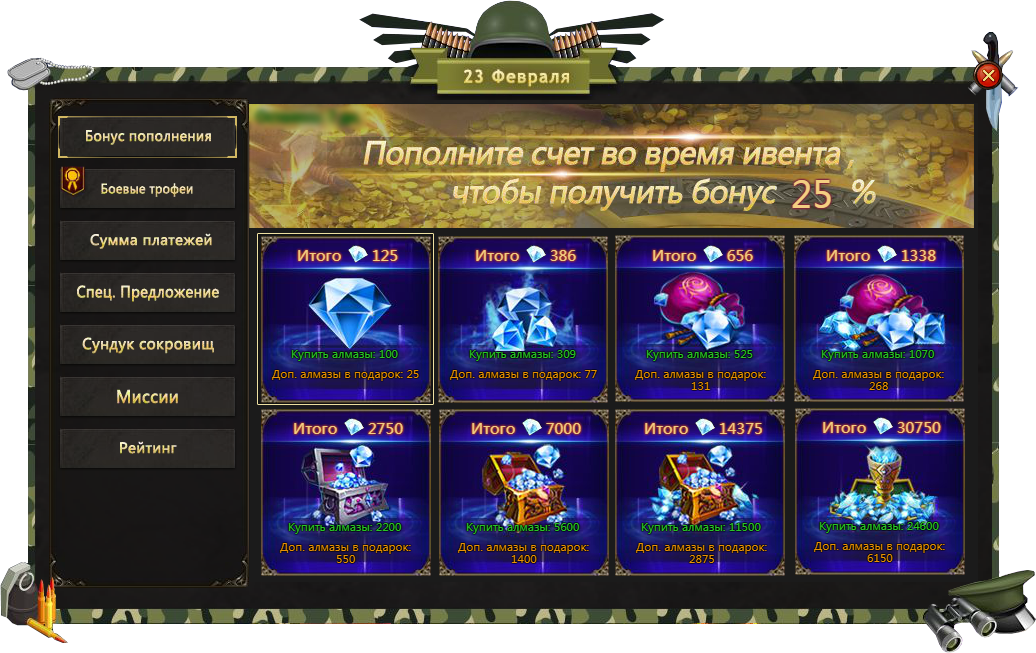 Приобретайте алмазы и получите 25%-й бонус к выбранной сумме в период действия специального предложения!