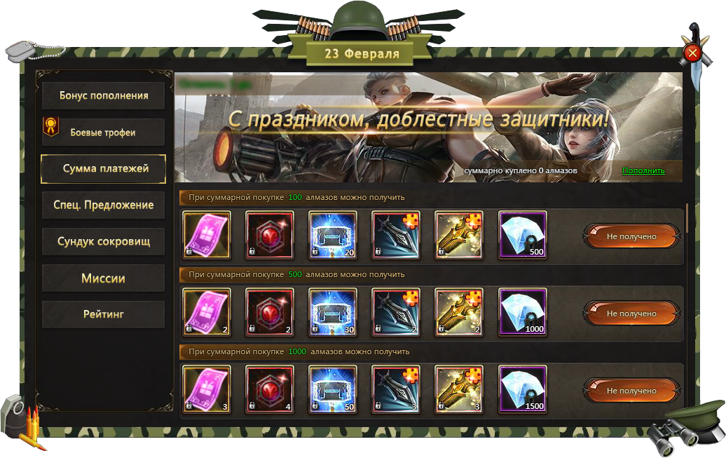 При общей покупке алмазов на определенную сумму вы получите дополнительную выгоду в виде множества ценных призов. Не упустите эту возможность!