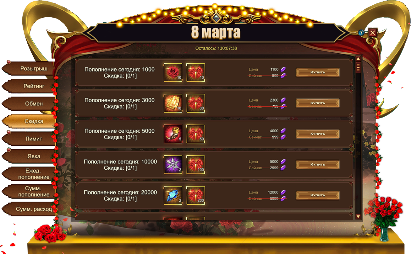 Обратите внимание, для активации скидки необходимо выполнить условие из первого столбца. Например, на скриншоте ниже, для приобретения со скидкой набора из 10 Цветков богини и 10 Бантов необходимо пополнить счет на 1000.