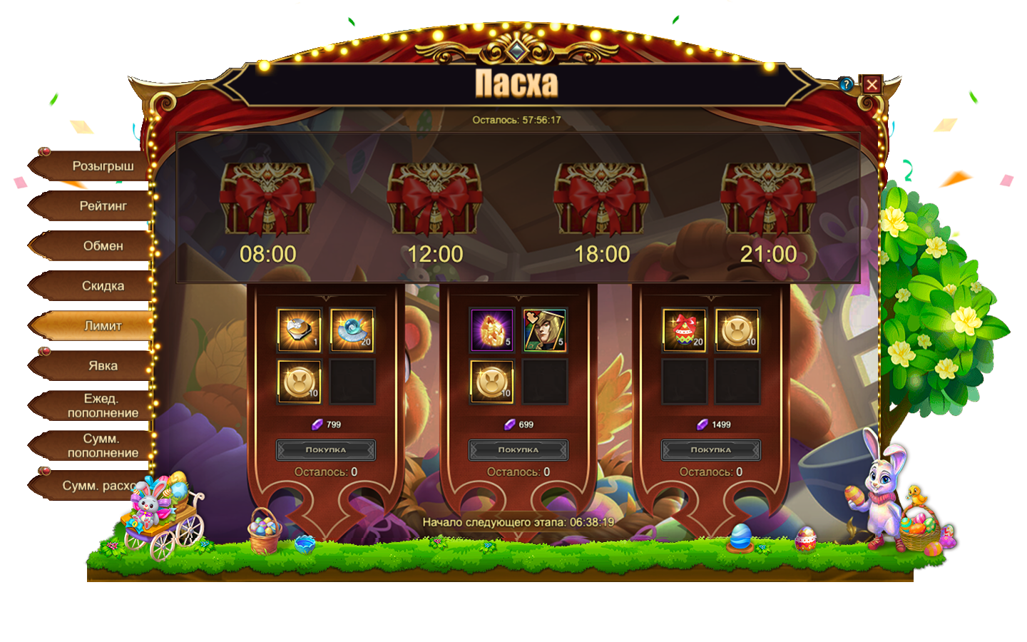 Обратите внимание, для активации скидки необходимо выполнить условие из первого столбца. Например, на скриншоте ниже, для приобретения со скидкой набора из 10 Праздничных яиц и 10 Кроличьих монет необходимо пополнить счет на 1000.