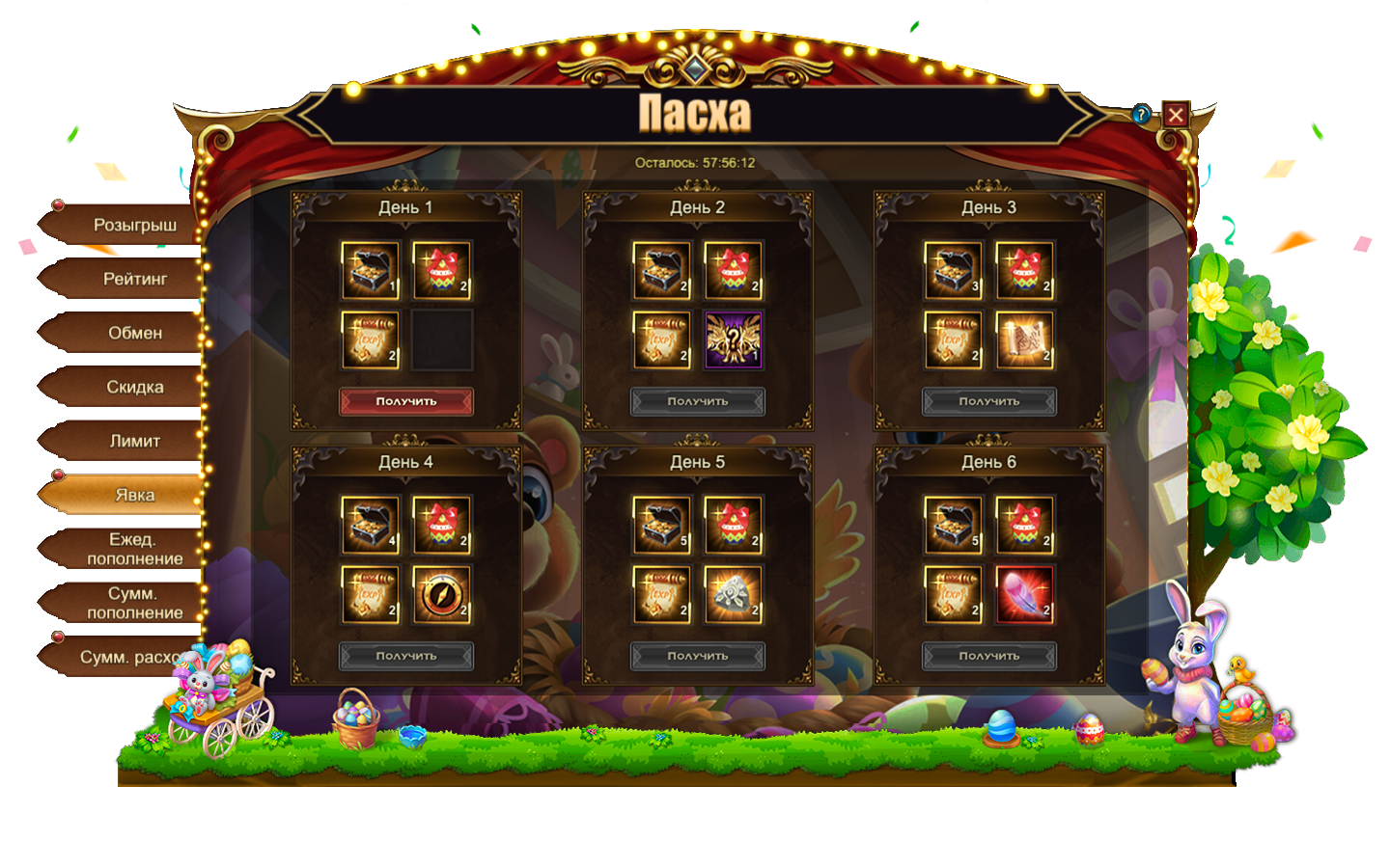 За посещение события ежедневно становятся доступны различные подарки. Например: Праздничное яйцоСумка золотаОранжевый свиток опыта, уникальный титул Пасхальный ГонецПотерянная картаПропуск на Арену, Компас и Перо финикса.