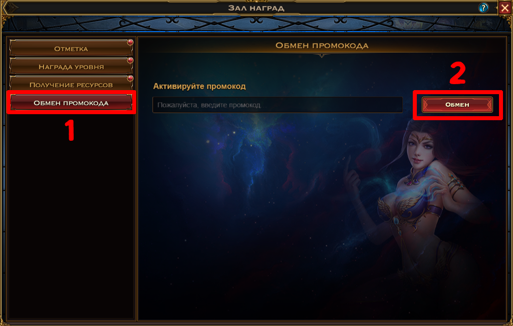 2. В открывшемся окне Зала Наград выберите вкладку "Обмен промокода" (1), введите имеющийся у вас промокод и нажмите кнопку "Обмен" (2).
