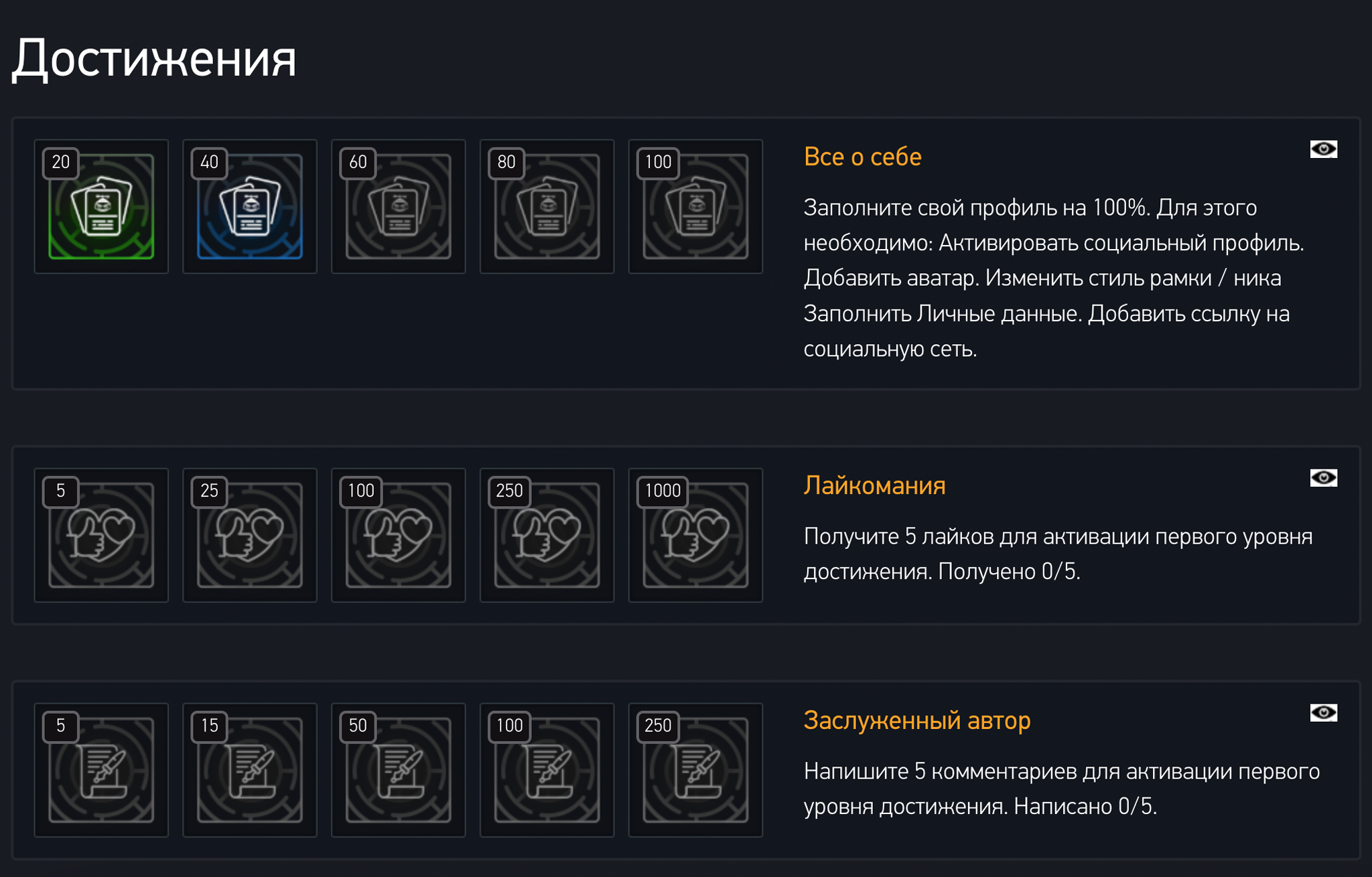 Рядом с каждым достижением написаны условия его получения и текущий прогресс. Достижения отображаются на странице социального профиля пользователя и видны другим пользователям портала (зависит от выбранного уровня приватности). Отображение конкретных достижений можно отключить при нажатии на специальную иконку в разделе Достижения. Для пользователей начиная с VIP 1 доступны достижения VIP.