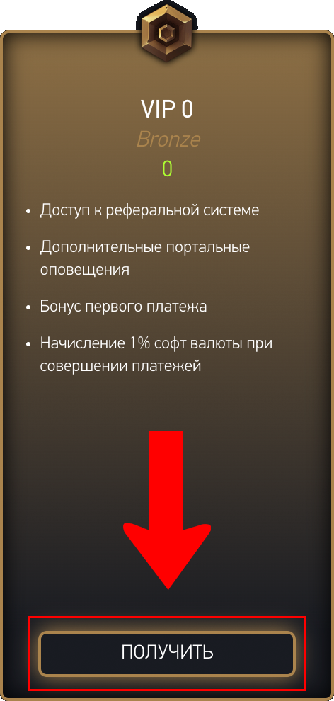 Обратите внимание, для активации доступного VIP уровня необходимо нажать на кнопку "получить" на соответствующей карточке VIP в разделе VIP.