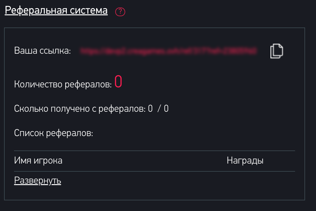 Отображается во вкладке Мои Привилегии раздела VIP. Для каждого пользователя доступна уникальная ссылка, по которой любой человек может зарегестрировать новый портальный аккаунт CreaGames.