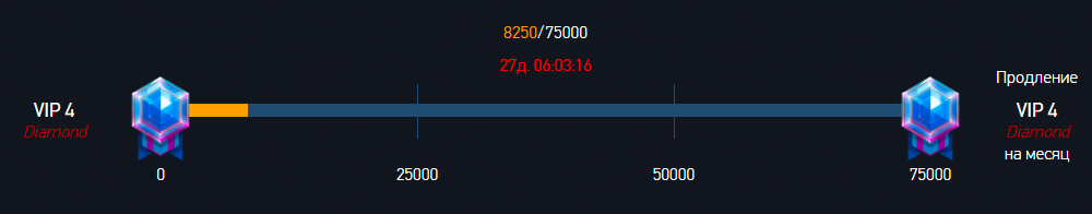 Алмазный уровень VIP является временным и по умолчанию активируется на 30 дней. Для его поддержания необходимо в течение 30 дней с момента активации Алмазного уровня VIP получить 75000 VIP опыта. В таком случае Алмазный уровень VIP будет автоматически продлен на следующий месяц.