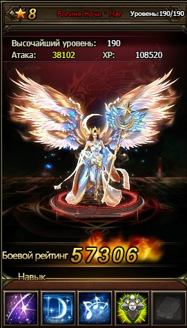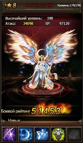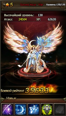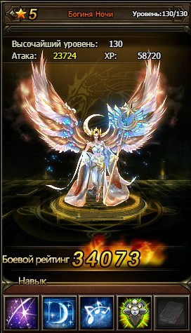 Ангельский ореол: Активный навык, (КД 2 раунда) атакует все цели, нанося 3000 дополнительного урона и игнорируя защиту.