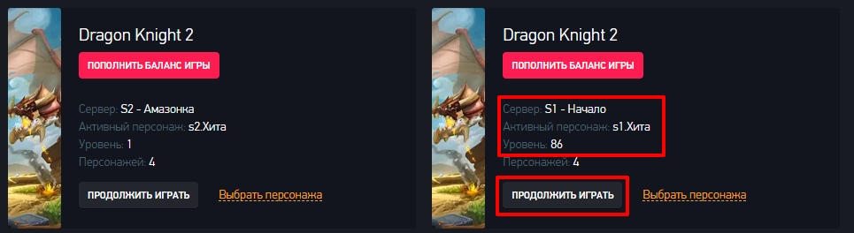 Если у вас несколько персонажей, то можно запустить несколько окон игрового клиента. Чтобы сделать это быстро, перейдите в личный кабинет, нажав на свой логин в верхнем правом углу. Вы увидите список своих персонажей. Нажмите "Продолжить играть" под нужным вам персонажем, чтобы открылась новая вкладка с игрой.