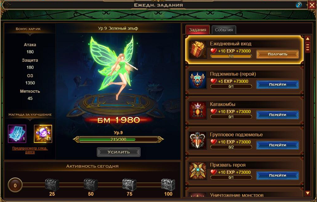 Также при помощи полученных очков вы можете усилить Зеленого Эльфа, который дает постоянный бонус к характеристикам и награду за повышение собственного уровня (Свиток Призыва х1 и Камень Повышения Героя х1). 1 очко активности равносильно одной единице опыта Эльфа.