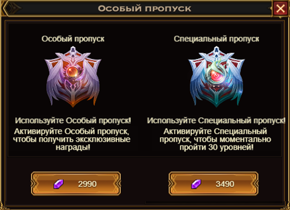 Для покупки доступны два варианта Особого Пропуска - базовый за 2990 аметистов и специальный за 3490 аметистов. Второй вариант сразу же прибавит к вашему текущему прогрессу 30 уровней.