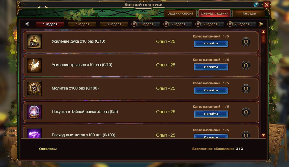 Раз в неделю вы можете трижды бесплатно обновить еженедельные задания. После использования всех бесплатных попыток каждое последующее обновление расходует 20 баленов или аметистов (если у вас нет необходимого количества баленов). Обратите внимание, в случае обновления количество выполнений заданий сохраняется, но его текущий прогресс сбрасывается.