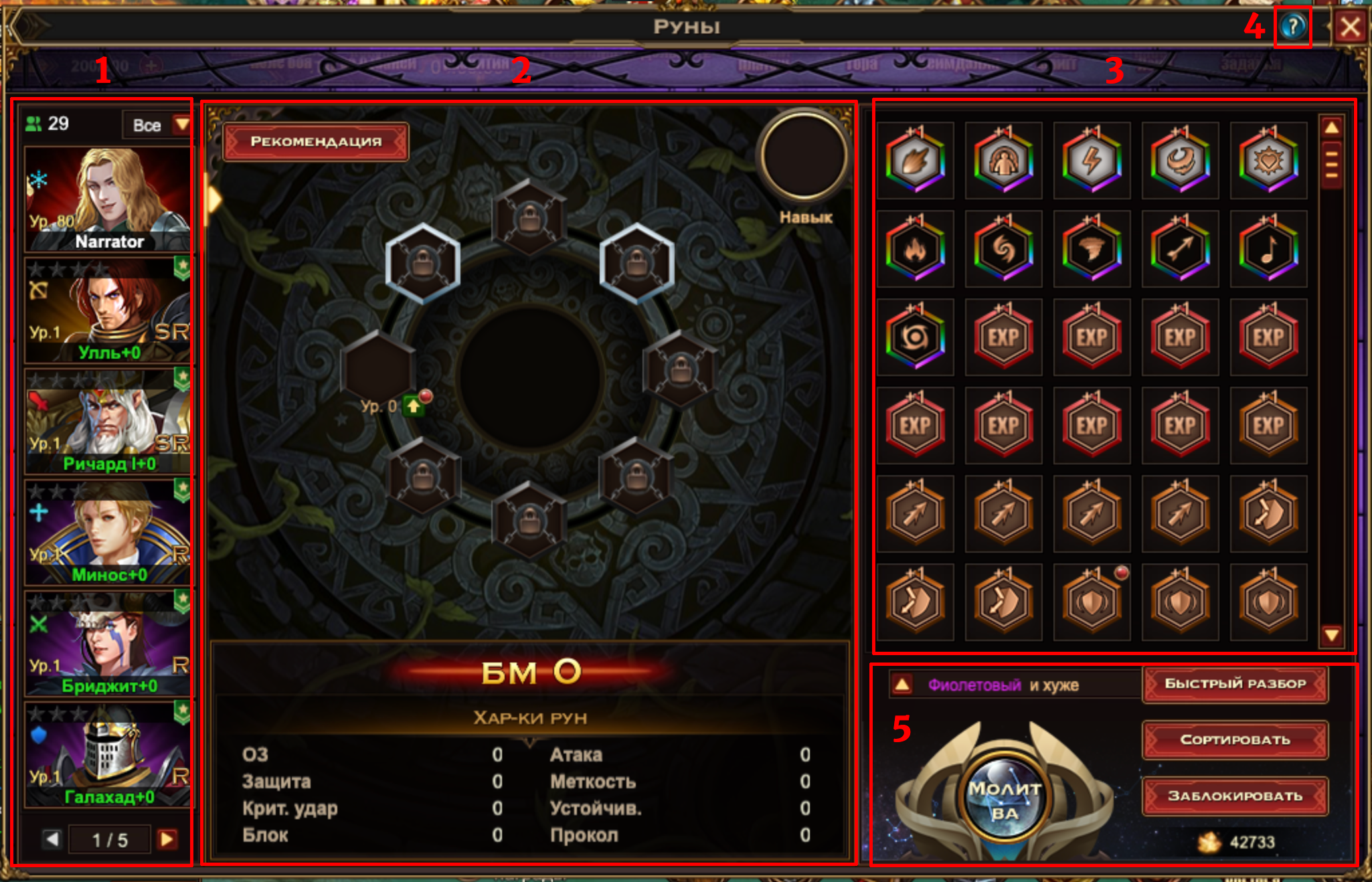 5. Окно взаимодействия с рунами - призыв, разбор, сортировка, блокировка.