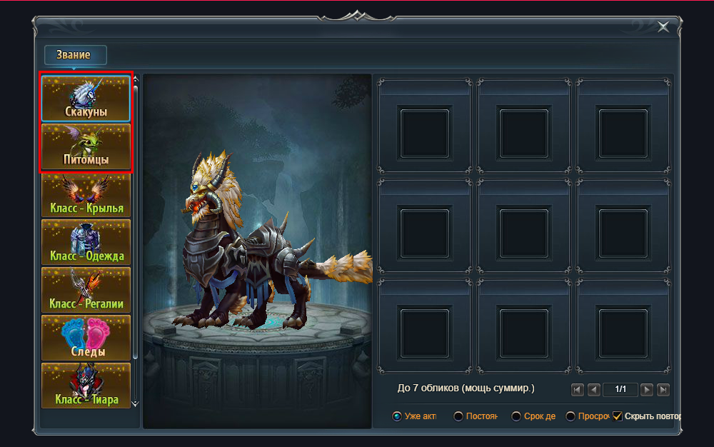 Меню развития Скакуна или Питомца можно вызвать горячей клавишей C или нажав на иконку «Герой», расположенную на нижней панели. В открывшемся окне с левой стороны расположены закладки, среди которых вы без труда найдете оба функционала. Рассмотрим основное меню на примере Скакунов. Его можно условно разделить на 7 блоков.