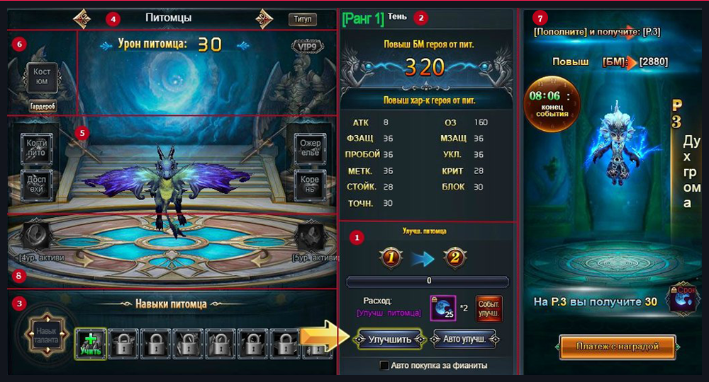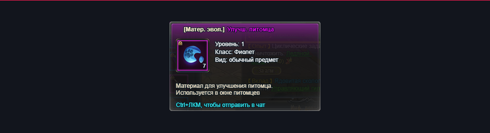В целом, окно функционала не имеет существенных различий. Его также можно разделить на аналогичные блоки, имеющие схожее значение. Для развития Питомцев используется специальный предмет - [Материал эволюции] Улучшение питомца. Добыть его можно в инстансе «Поход героев» и «Элитном» инстансе, выменять в лавке заслуг, купить за фианиты и алмазы, получить в событии «Сад Гильдии» и т.д.