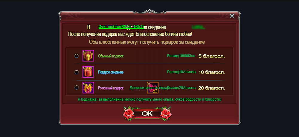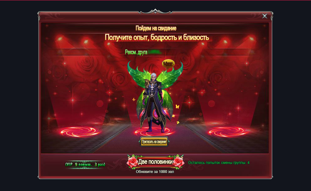 Перед вами будет представлен список из трёх игроков противоположного пола. Обновить список можно 3 раза за 1000 золота, если не активирован VIP. С повышением уровня VIP появляются дополнительные попытки. Чтобы свидание состоялось, необходимо согласие обоих игроков. В открывшемся окне будет отображаться имя выбранного кандидата и список подарков, за которые можно получить благословение богини.