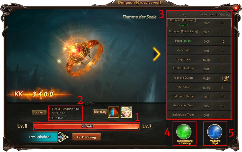 Siegelring hat Erfahrungssystem (1) - mit jedem Level bekommt Ring besser und gibt Ihnen mehr Eigenschaften (2). Sie können Siegelring Erfahrung für Quests (3) bekommen. Am ersten Levels können Sie Magische Kugel und Fragmente der Göttinnen bekommen (Demeter, Artemis, Nemesis, Rhea, Aphrodite). Dann werden Sie mit jedem Level Zirkonia bekommen.