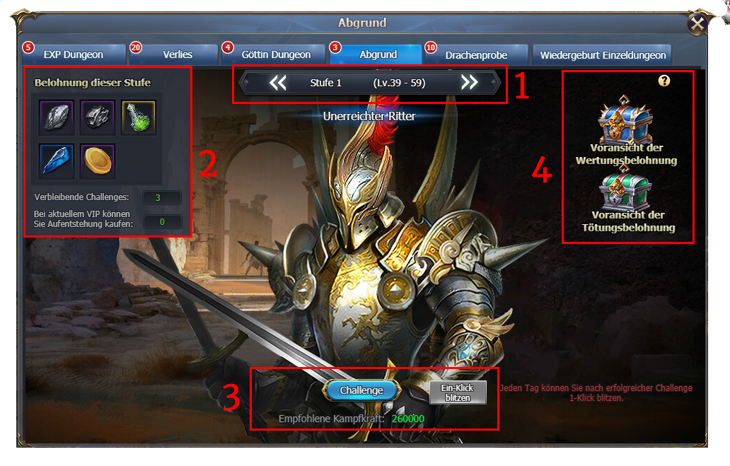 3. Um Kamp zu starten muss man “Challenge” Taste klicken. Jeden Tag Nach erfolgreicher Challenge kann man Abgrund blitzen. Neben “Challenge” Taste können Sie empfohlene Kampfkraft diese Stufe sehen.