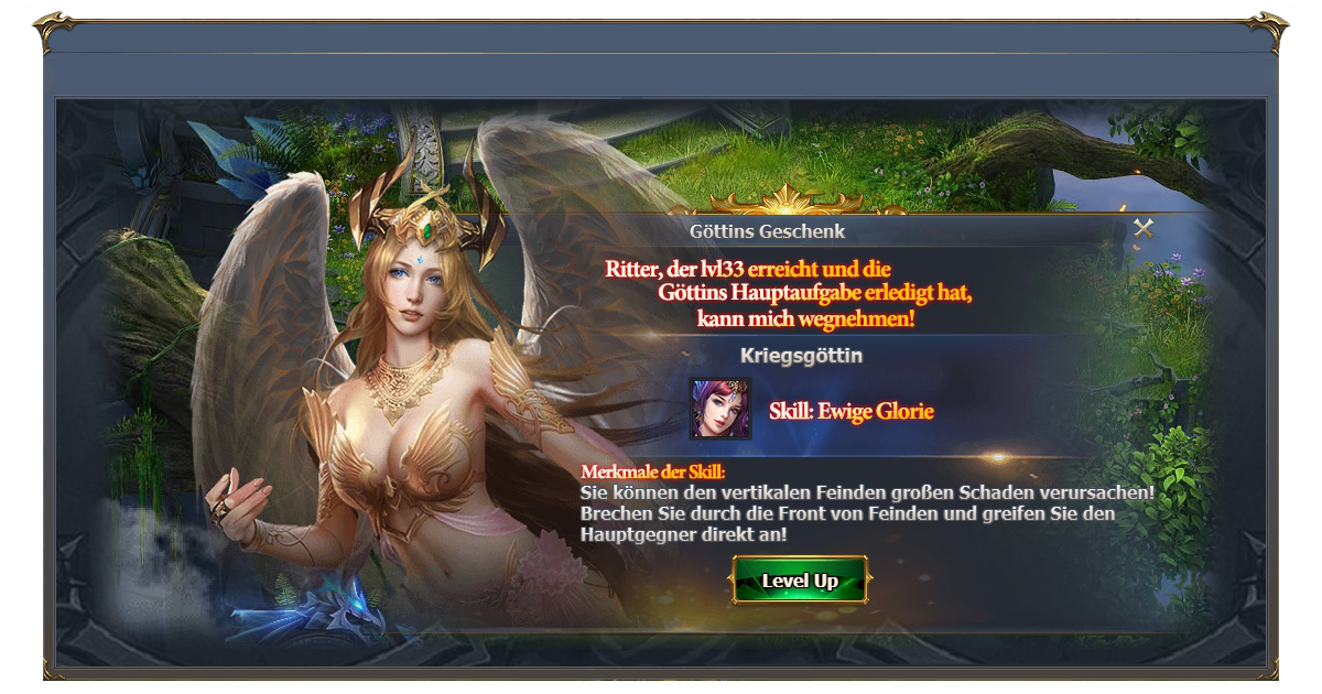 Skill: Ewige Glorie für Kriegsgöttin. Damit können Sie den vertikalen Feinden großen Schaden verursachen. Brechen Sie durch die Front von Feinden und greifen Sie den Hauptgegner direkt an!