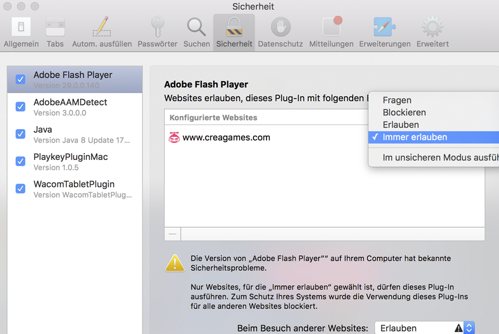 6. Wählen Sie Adobe Flash Player. Ein neues Menüfenster wird geöffnet. Suchen Sie nach "Beim Besuch anderer Websites" und wählen Sie "Zulassen" aus dem Dropdown-Menü.