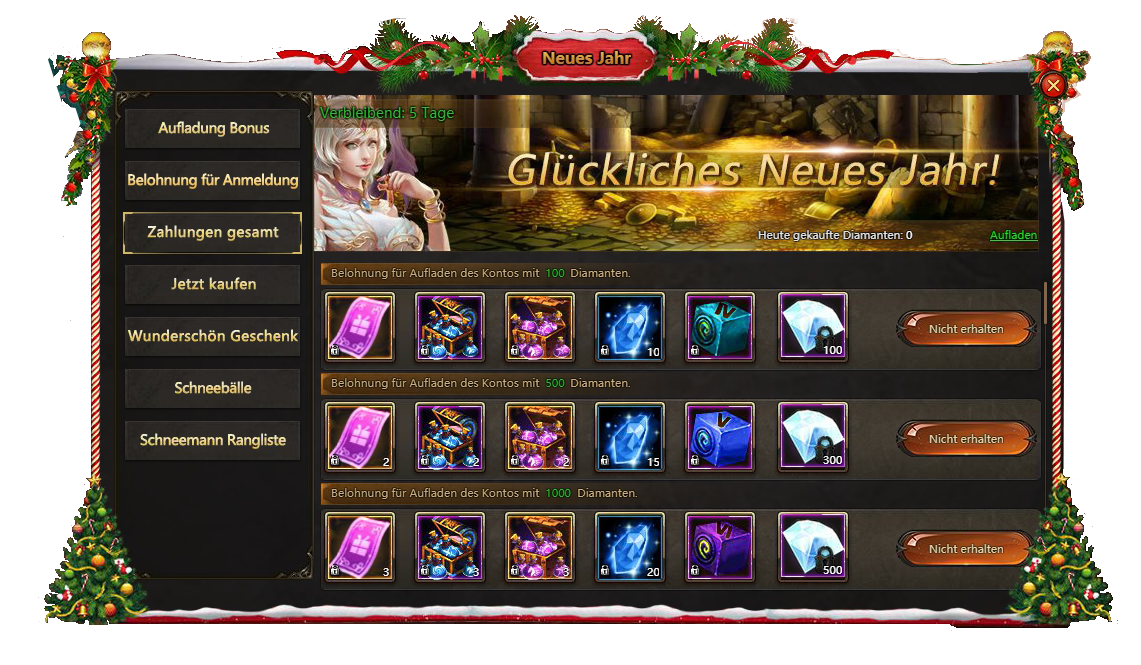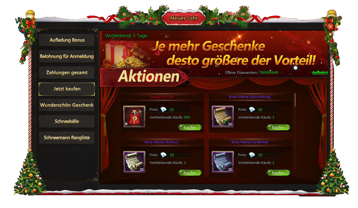 Im Aufladung Bonus finden Sie eine Übersicht zum aktuellen Aufladebonus. Nur diesen Winter können sie mehr Diamanten zum gleichen Wert kaufen.