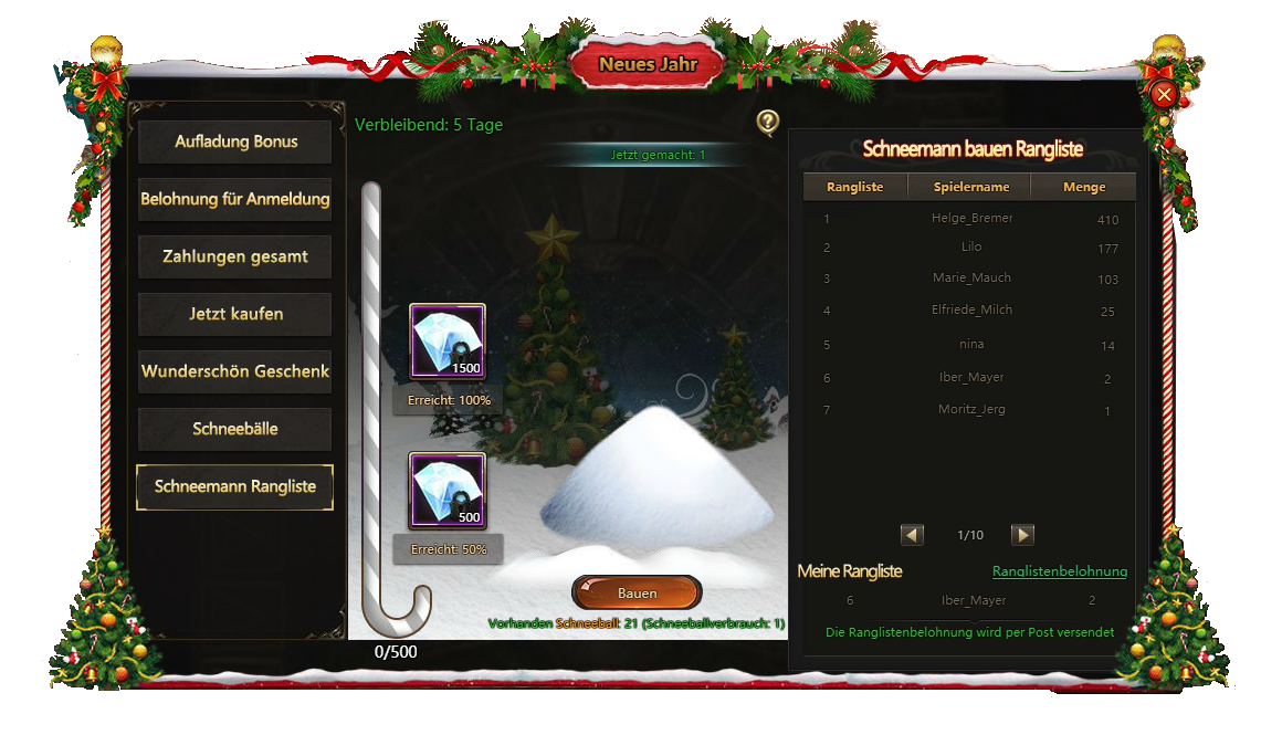 Schneemann Rangliste - diese ist für den gesamten Server. Hier ist also Teamwork gefragt. Pro Schneeball gibt es einen Punkt. Wenn der Punktezähler  250 und 500 Punkte erreicht, erhalten alle Spieler des Servers Preise! Dies kann mehrmals pro Tag passieren.