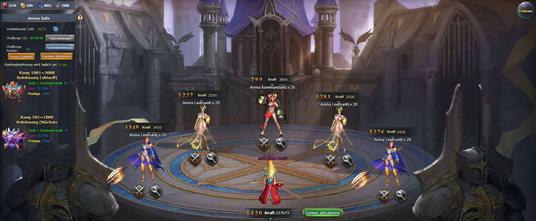 Man kann täglich in Arena 15 Mal kämpfen, aber Sie können 20 Challange Versuchen mehr mit Rubine oder Saphire kaufen.