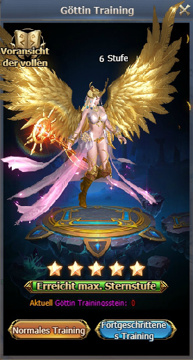 Jede Stufe verbessert Eigenschaften der Göttin. Mit Klick auf “Voransicht der vollen” kan man 6. Stufe Göttin sehen.