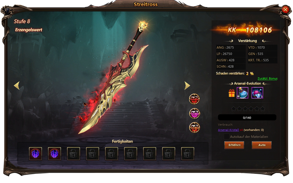 Ihr entwickelt Arsenal mit Arsenal-Kristallen (erhältlich im Arsenal- Dungeon). Das machen sie mit Streitross/ Flügel / Aura.. u.s.w
