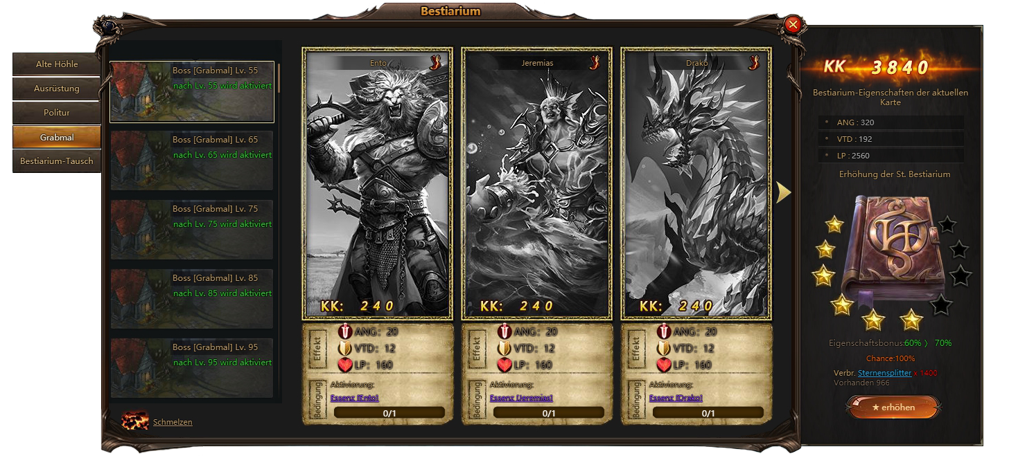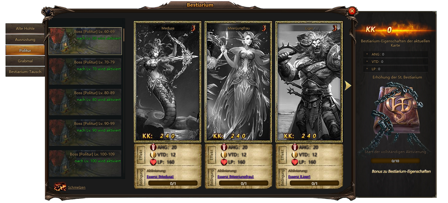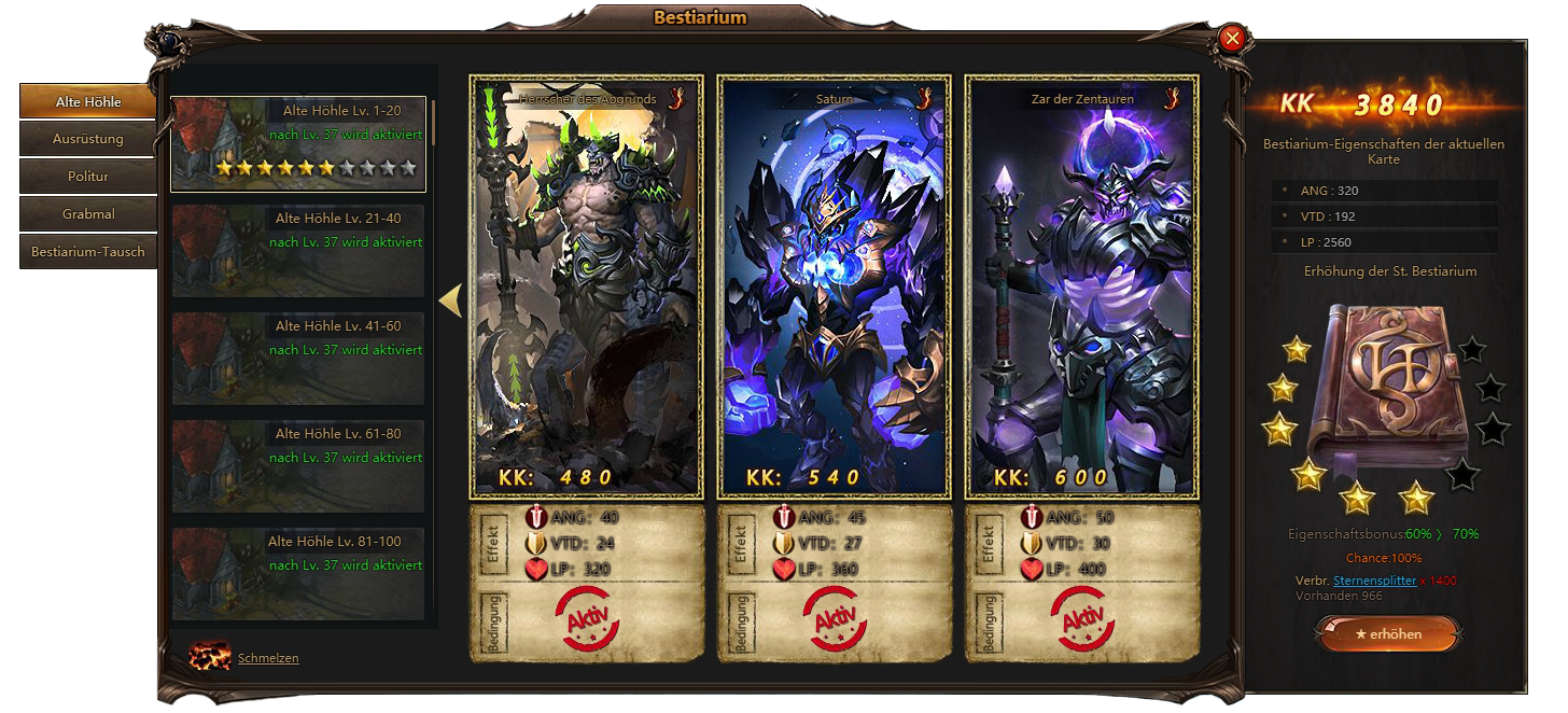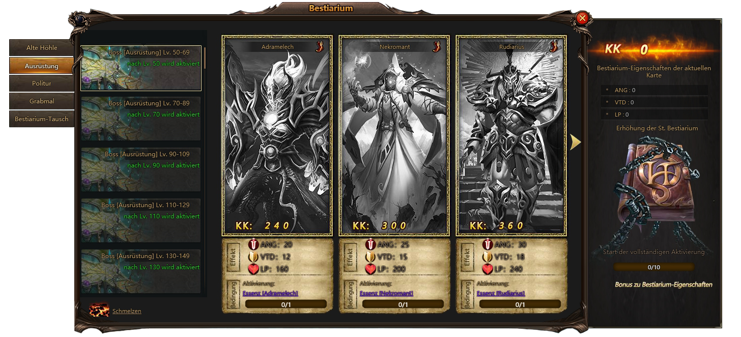 Bestiarium Funktional ist ab Level 37 verfügbar. Zuerst haben Sie nur 1 Tab - Alte Hohle. Im Lauf der Zeit und Progress werden andere Tabs verfügbar.