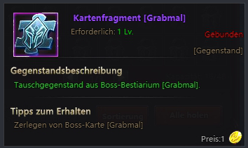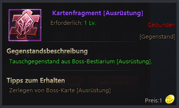 In diesem Tab kann man Boss Essenzen mit Kartenfragmente kaufen. Es gibt 3 Kartenfragment Typen: