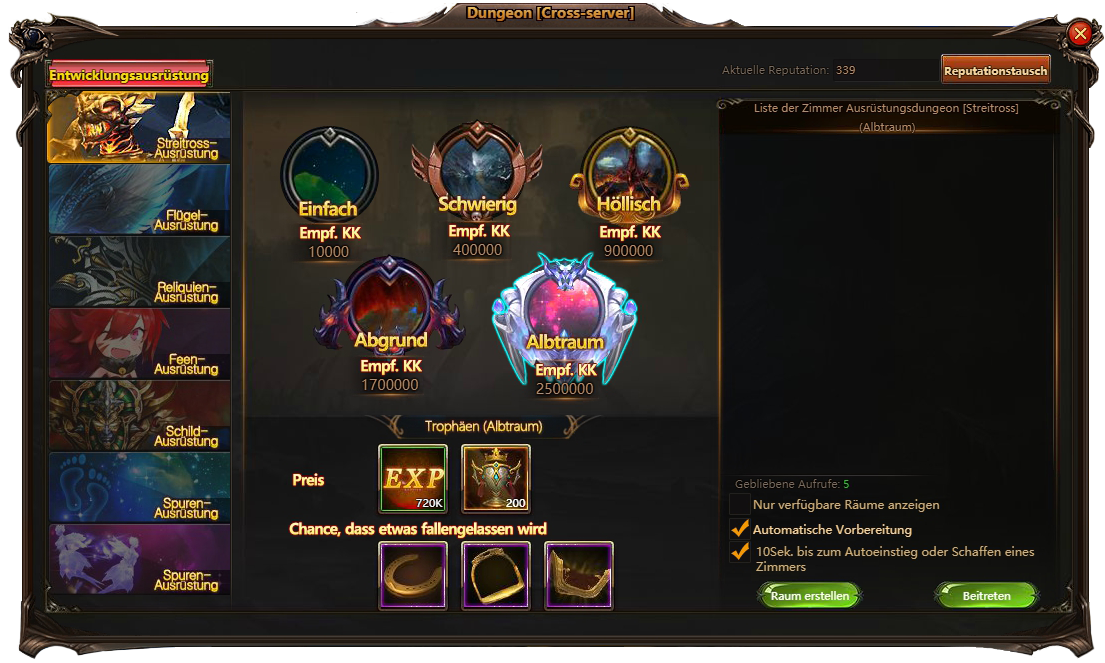 Jeder Schwierigkeitsstufen hat KK Empfehlungen - mit weniger KK können Sie diesen Dungeon nicht besuchen. Jeder Tag haben Sie 5 Aufrufe.