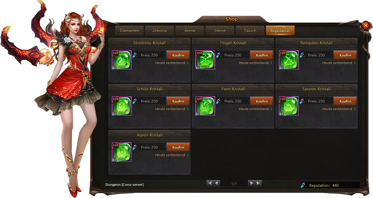 Im Reputation Shop können Sie Reputation für Kristallen tauschen (nur 2 Kristallen jeder Typ pro Tag)
