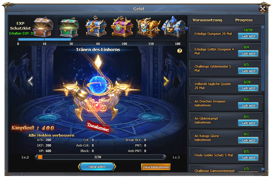 Um Geist zu entwickeln Sie müssen Täglich Quests abschließen. Für jeder Quest Sie bekommen Erfahrung des Geist, Charakter Erfahrung und andere Ressourcen.