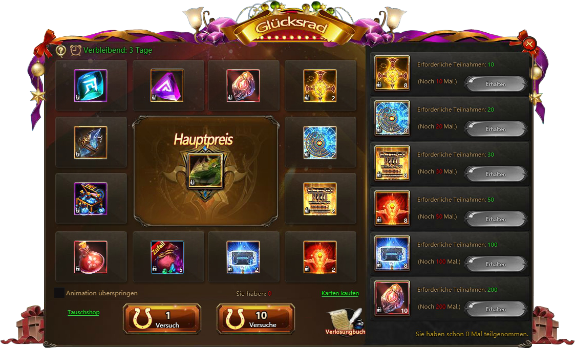 Glücksrad Event - spinnen Sie die Rulette und erhalten schone Belohnungen.