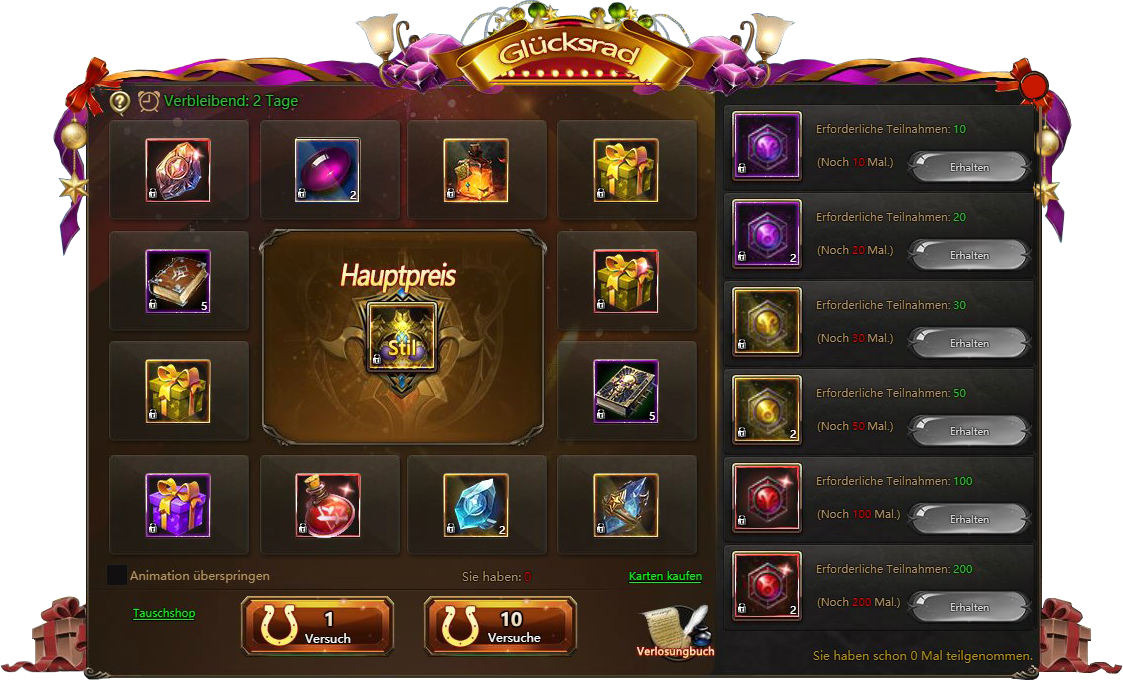 GlücksradPunktetausch und Aufwand Rangliste werden um 12:00 (CET) Freitags (24.07.2020) beginnen und bis 12:00 Montags (27.07.2020) dauern.