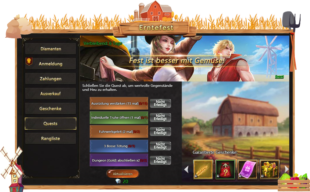Anmeldung - besuchen Sie Erntefest taglich und bekommen verschiedene Belohnungen;