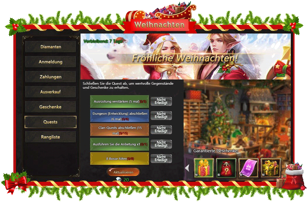 Glocken läuten, Lichter leuchten, Weihnachtsbäume sind so hell und bunt! Wir hoffen, Sie haben es geschafft, alle Geschenke für Ihre Lieben zu besorgen. Und dass Sie etwas Erstaunliches für sich selbst bekommen. Morgen beginnen die Weihnachtsevents in Rise of Angels. Vergiss nicht, all die tollen Geschenke für deine Charaktere mitzunehmen.