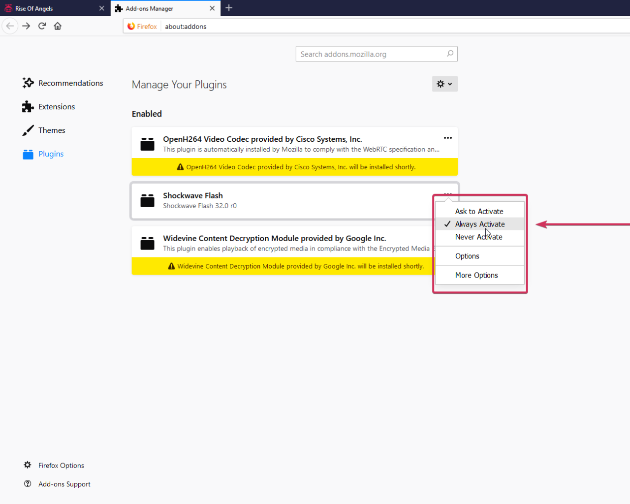 1. After installing Flash Player, type “about:addons” in the address bar and press Enter. Learn more about installing the player here