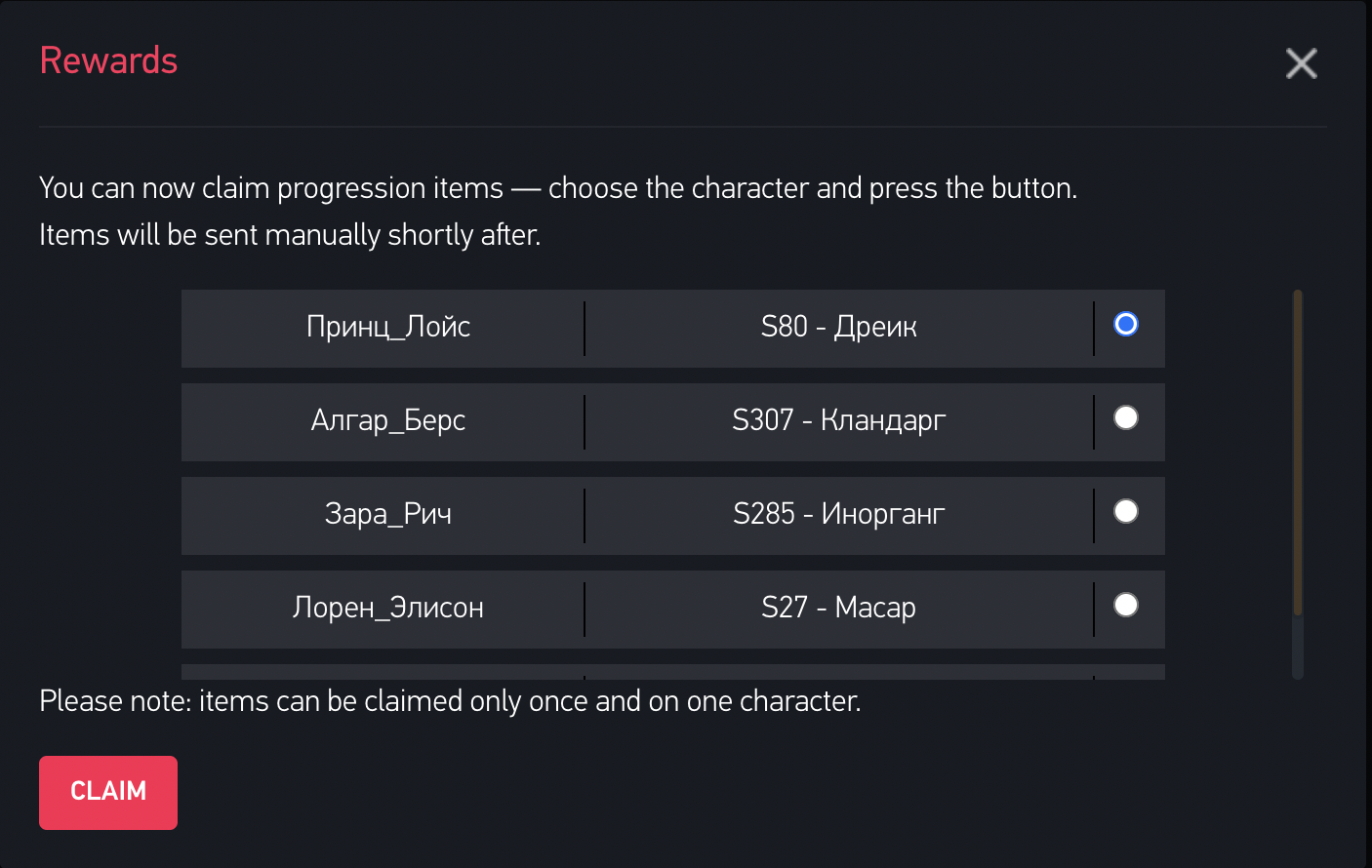 Click the "Claim" button. The items and privileges will be sent to the selected character shortly afterward.