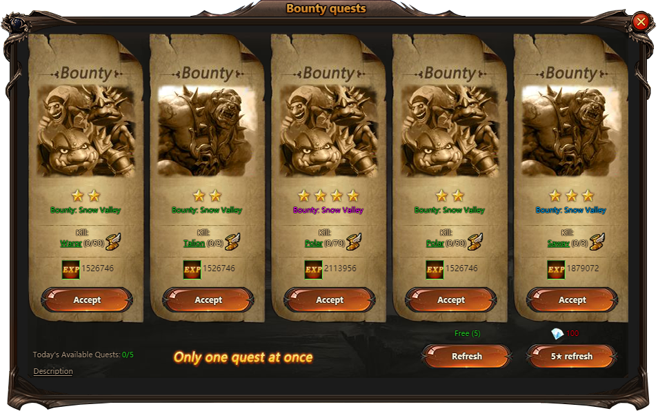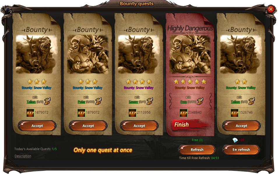 By clicking the ‘Refresh’ button all current tasks available will be replaced with another 5 random Bounty tasks. You have 5 free refreshes available, a single refresh has 5 minutes cooldown. If you don’t want to wait for free refreshes, you may spend 10 000 gold pieces to skip the cooldown and refresh the tasks instantly. There is also an option to gain 5 stars tasks by using '5* refresh' button, which costs 100 diamonds.