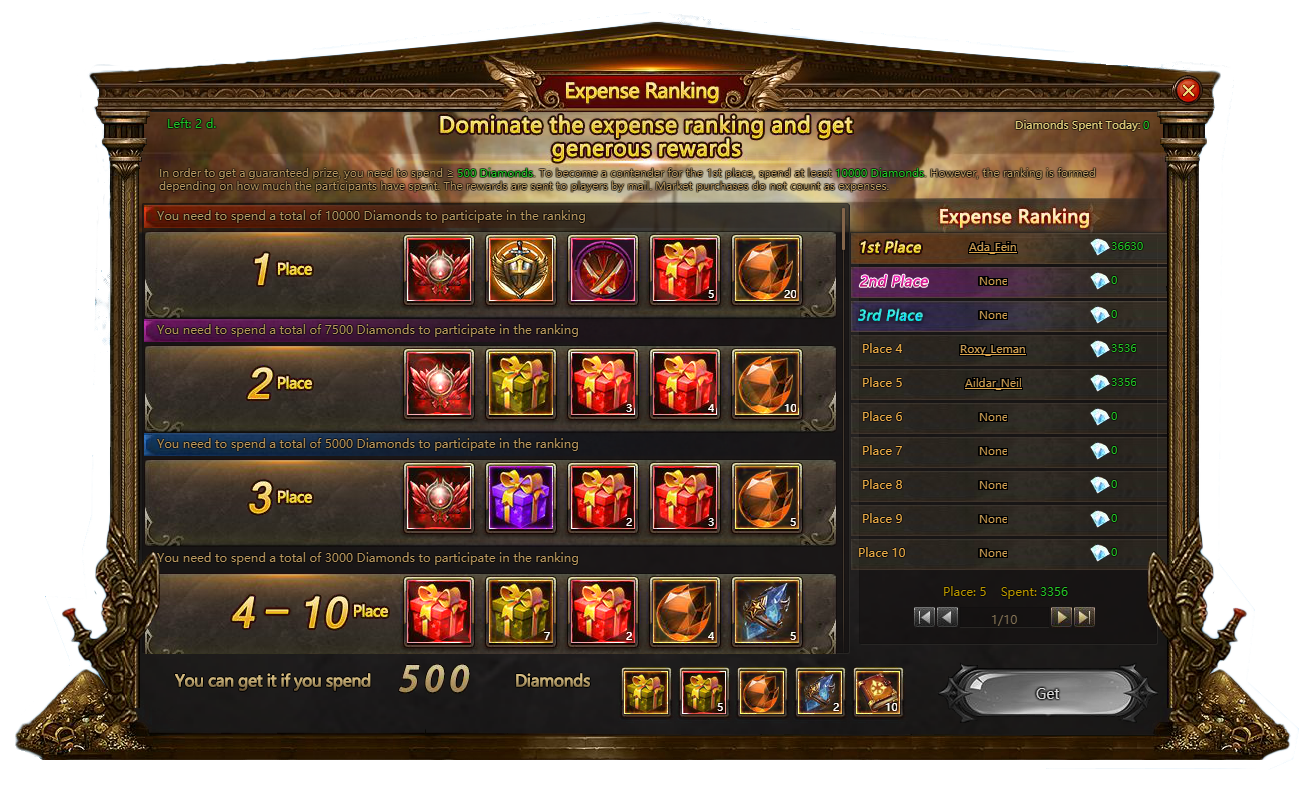 From 06.21.2019 00:00 (EST) till 06.23.2019 23:59 a single diamond spent counts in Expense Ranking. By spending 500 diamonds you instantly get a reward. The more diamonds you use during the event the more rewards you receive in the end. For example, first place items include tree Gifts of Death that instantly increase your CP for 350 000 points and activate ultimate passive skills.