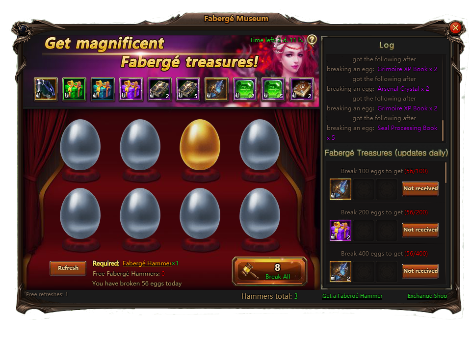 After each refresh you have a chance to find the Golden Egg, by cracking it you can gain the following items:
