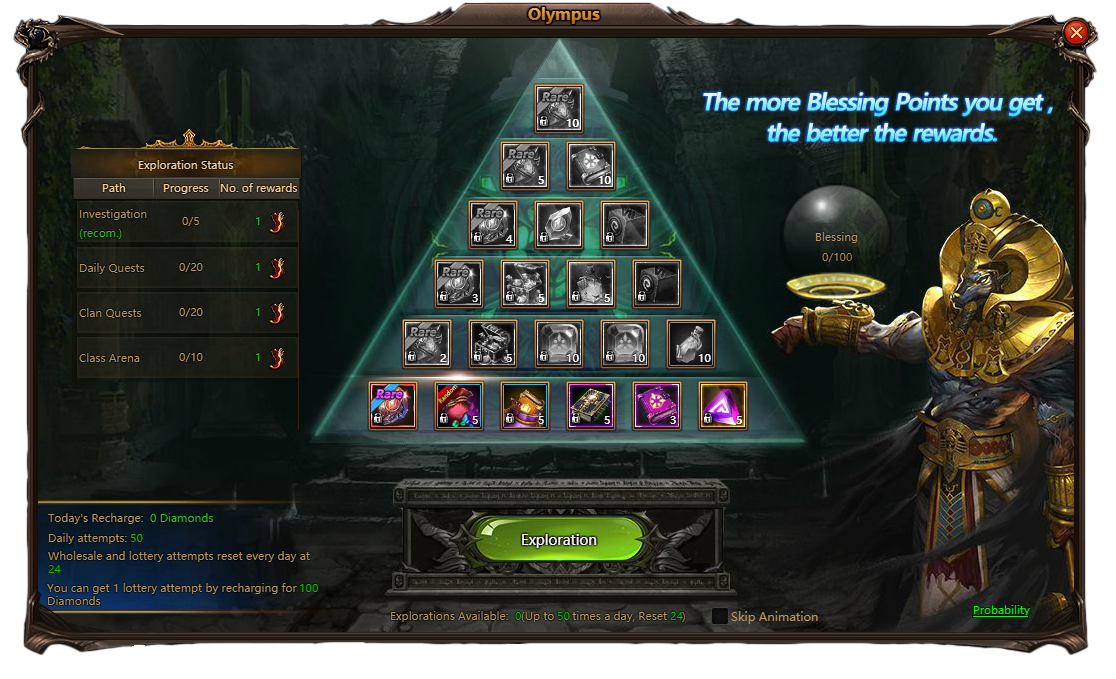 To climb up, you need to spend Exploration attempts. Once you clicked the Exploration button, you get random reward available on the particular floor. To get higher, you need to fulfill the Blessing shard or to score rare item. If you are lucky, you may complete the level even with the first exploration. When you get 100% blessing, you move upward and get rare item anyway.