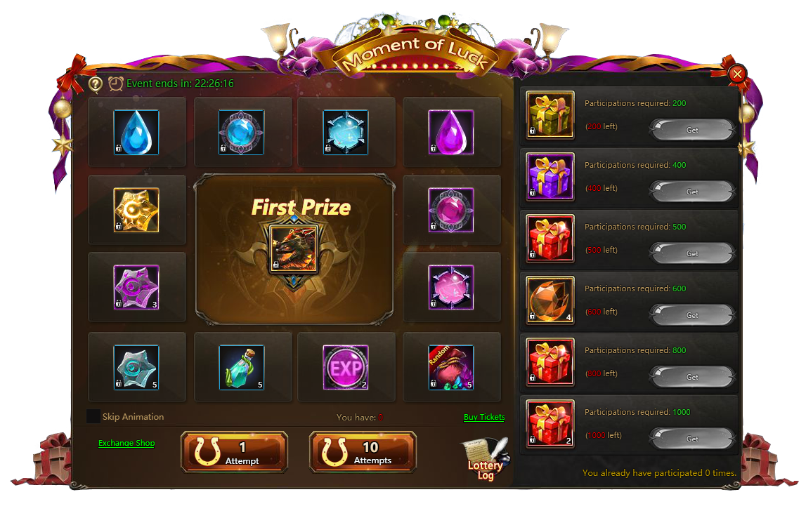 Starting from 5:00 am 06.14.2019 till 11:59 pm 06.16.2019 we run Moment of luck event. Test your luck to win a broad variety of valuable trophies.