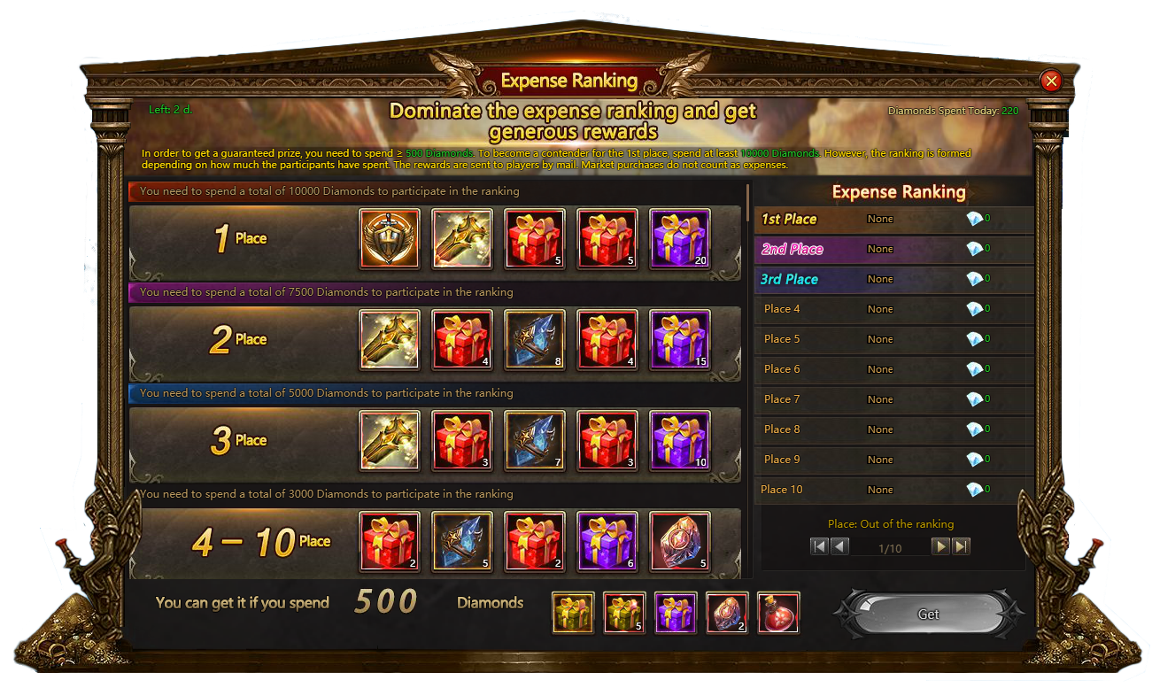 From 07.18.2019 00:00 (EST) till 07.21.2019 23:59 a single diamond spent counts in Expense Ranking. By spending 500 diamonds, you instantly get a reward. The more diamonds you use during the event, the more rewards you receive in the end. For example, first place items include tree Gifts of Death that instantly increase your CP for 350 000 points and activate ultimate passive skills.