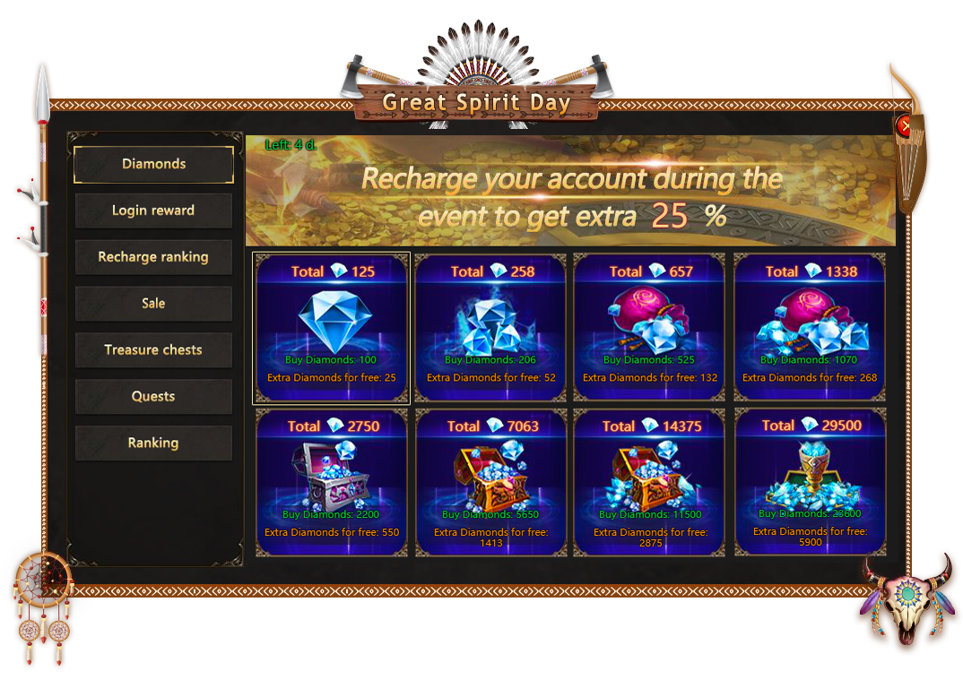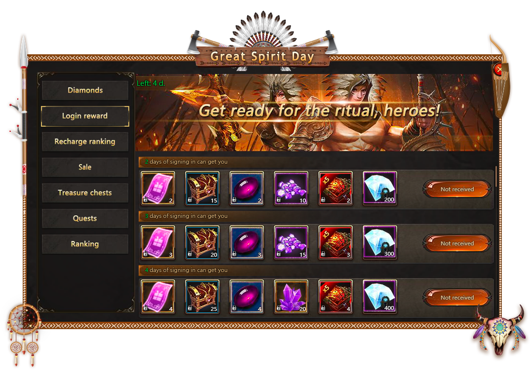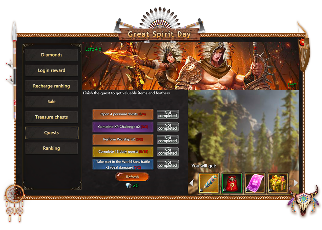 When nature is going to winter hibernation, the time of Great Spirit is about to come. It's mission is to protect lands during frosty season, but traditionally various clans from different territories have to gather together and start a grandiose fest in honor of their defender. So let Great Spirit Day begin and may it bring many adventures, rewards and new friends! All of this will be awaiting from 6am October 16 to 6am October 23 - have fun!