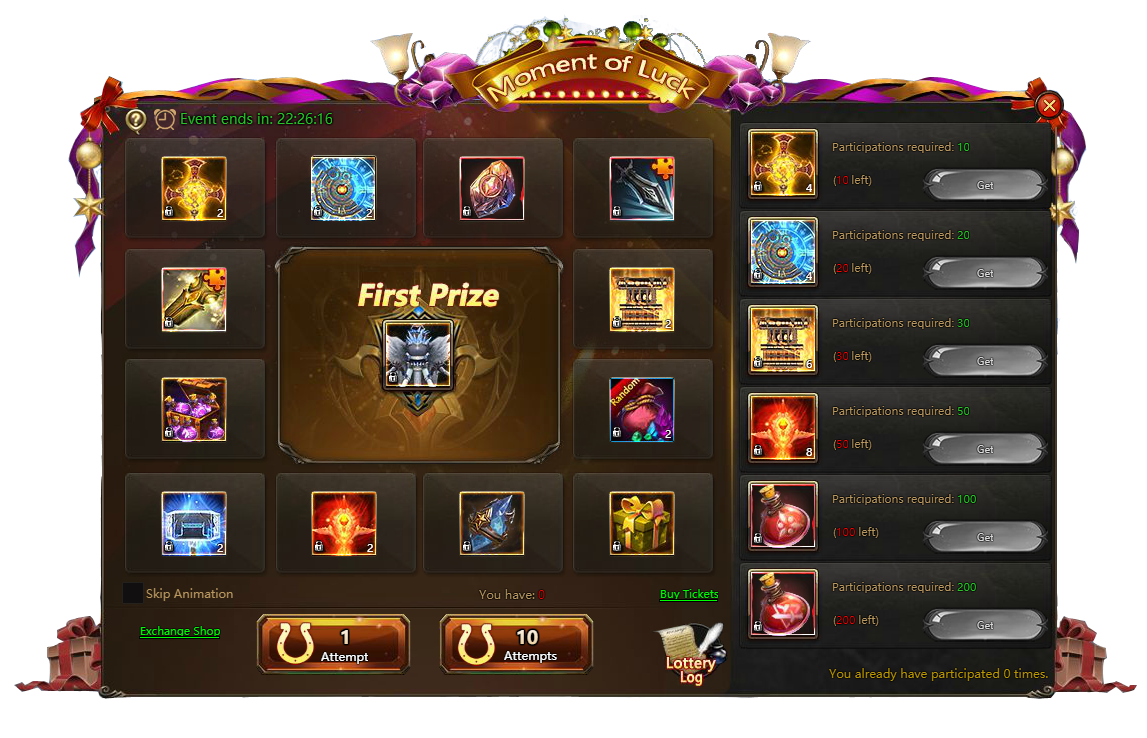 Starting from 5:00 am 05.17.2019 till 11:59 pm 05.19.2019 we run Moment of luck event. Test your luck to win variety of valuable trophies.