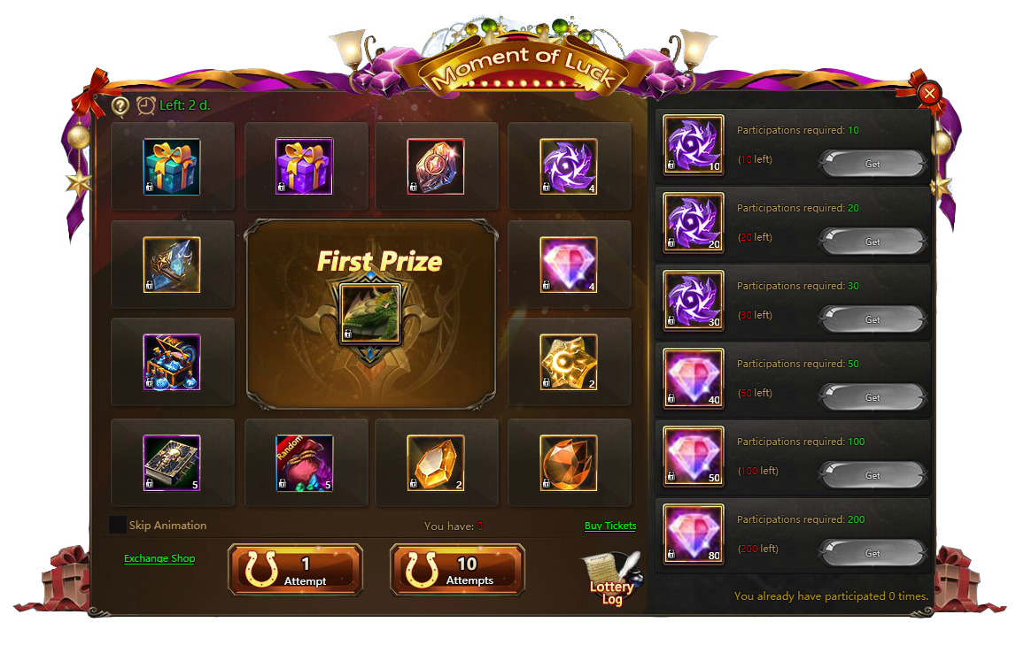 To play roulette you need to spend a Treasure Lottery Ticket. You may obtain such ticket by purchasing Luck Keys. The Luck Key cost 20 diamonds.