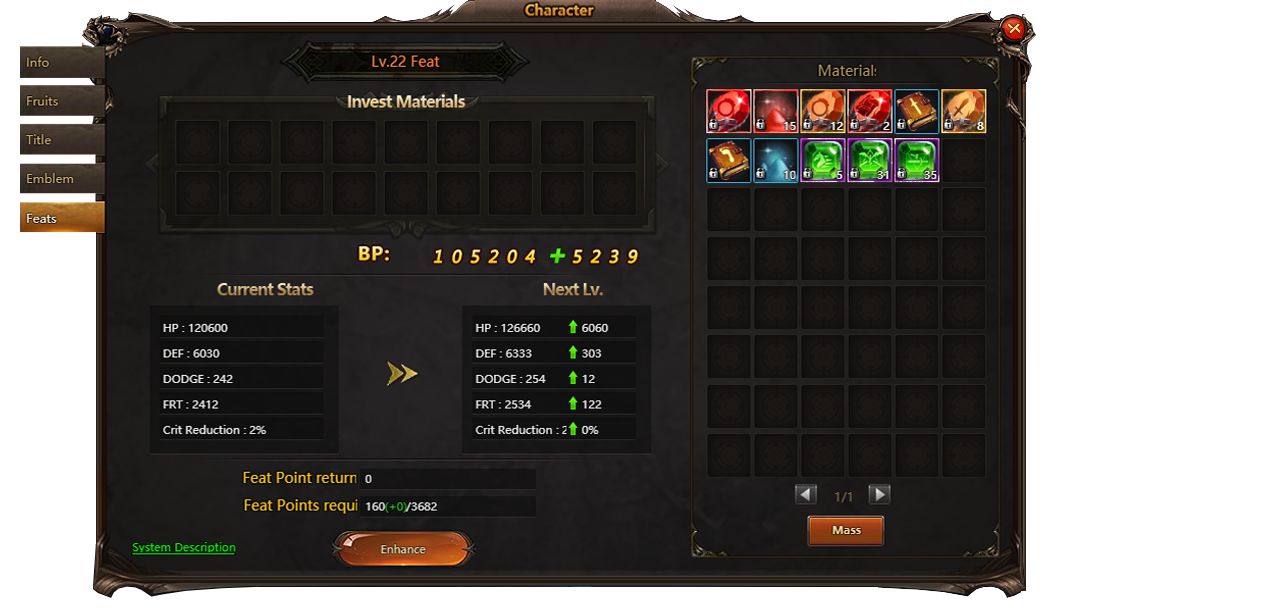 Feats - invest materials and receive feat points to level-up and increase your defense index.