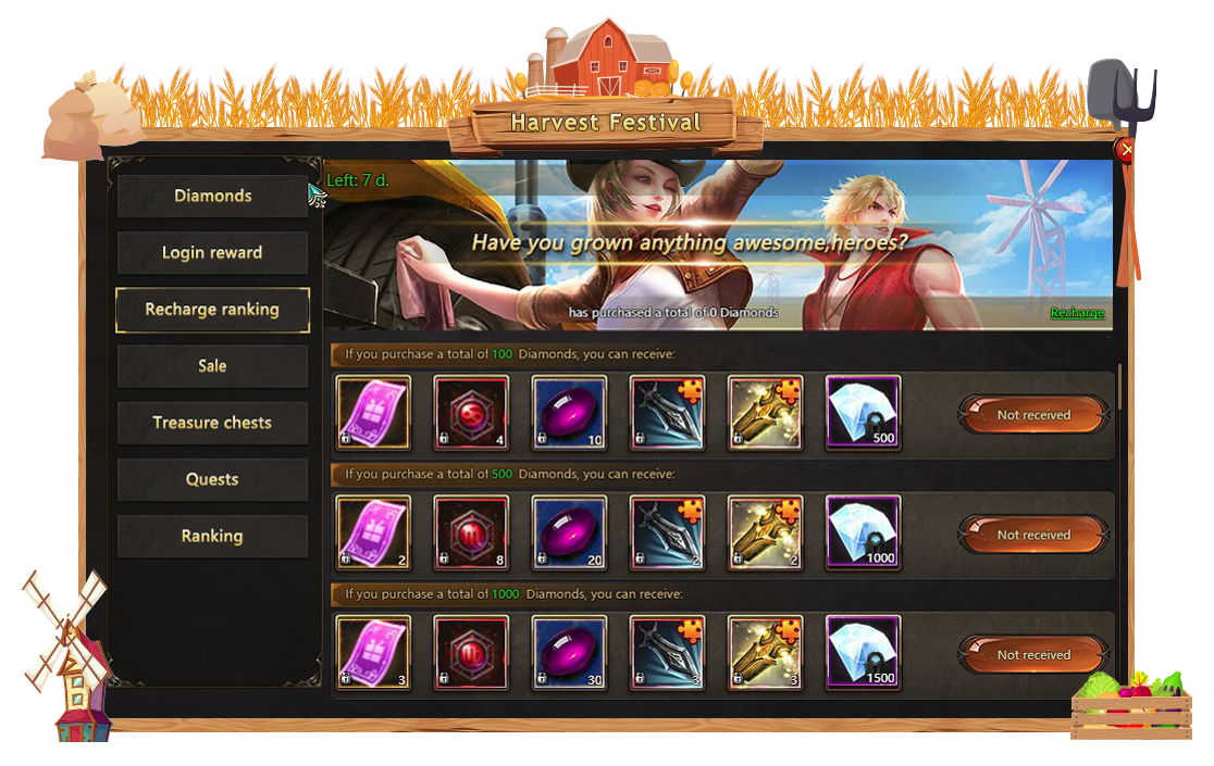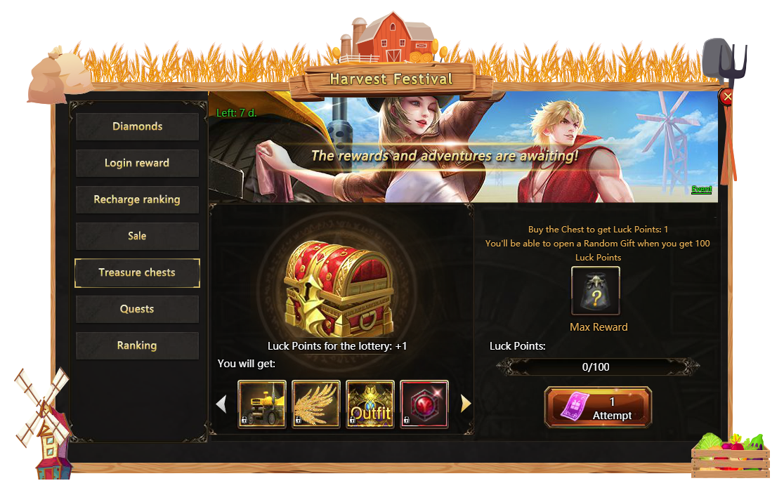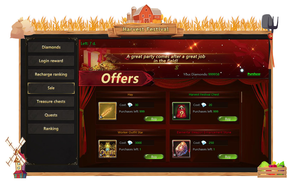 We've been working hard all summer, growing delicious vegetables and fruit, and what now, heroes? It's about time we started Harvest Festival! Put away all the instruments, call all your friends and get ready to participate in the biggest party of this summer. Holiday events, shiny rewards and special skins will be waiting for you from 6am August 7 to 6am August 14. Don't miss the fun!